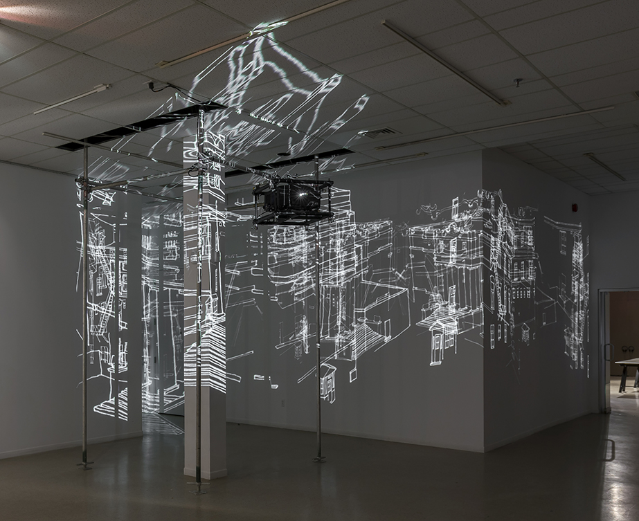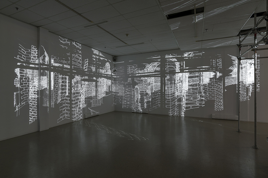 Il existe deux versions de l’installation in situ Les mailles du Vieux Palais dont l’origine est un bâtiment emblématique de la ville de Saint-Jérôme. Appelé par plusieurs Le Vieux Palais, cet ancien palais de justice et prison est aujourd’hui devenu un lieu culturel important qui accueille entre autres le Musée d’art contemporain des Laurentides. L’installation prend racine dans un moment charnière de l’histoire du lieu, un moment de basculement alors que l’avenir du bâtiment est devenu incertain. Suite à une prise d’otages en 1978, le bâtiment fût menacé d’être démoli puisque jugé trop dangereux pour le centre-ville. Grâce à une série de photographies prises lors d’une visite guidée pendant cette période transitoire, j’ai pu échantillonner des traces d’absence, extraire et tracer des formes qui m’ont servi à modéliser une nouvelle architecture. C’est sur ce canevas que s’animent et se croisent simultanément les traces de différentes époques, unifiées par la ligne dessinée. L’oeuvre se matérialise ici comme un processus de transformation de l’environnement immédiat où les lignes projetées tissent des brèches dans l’espace au contact de ses surfaces en proposant des points de vue alternatifs du lieu.