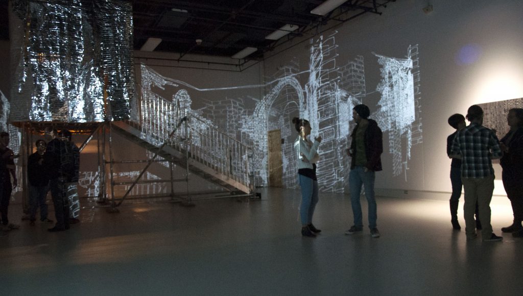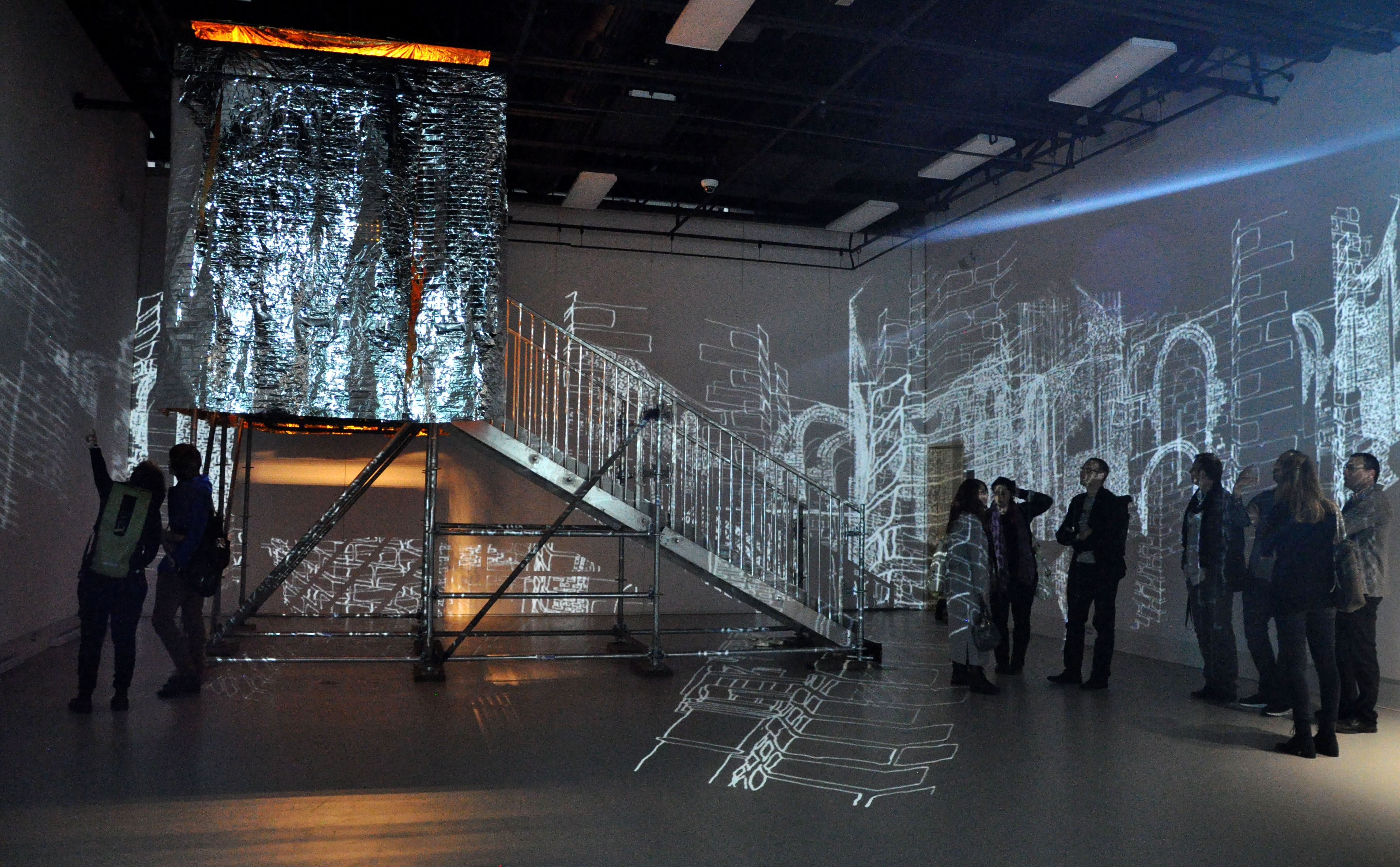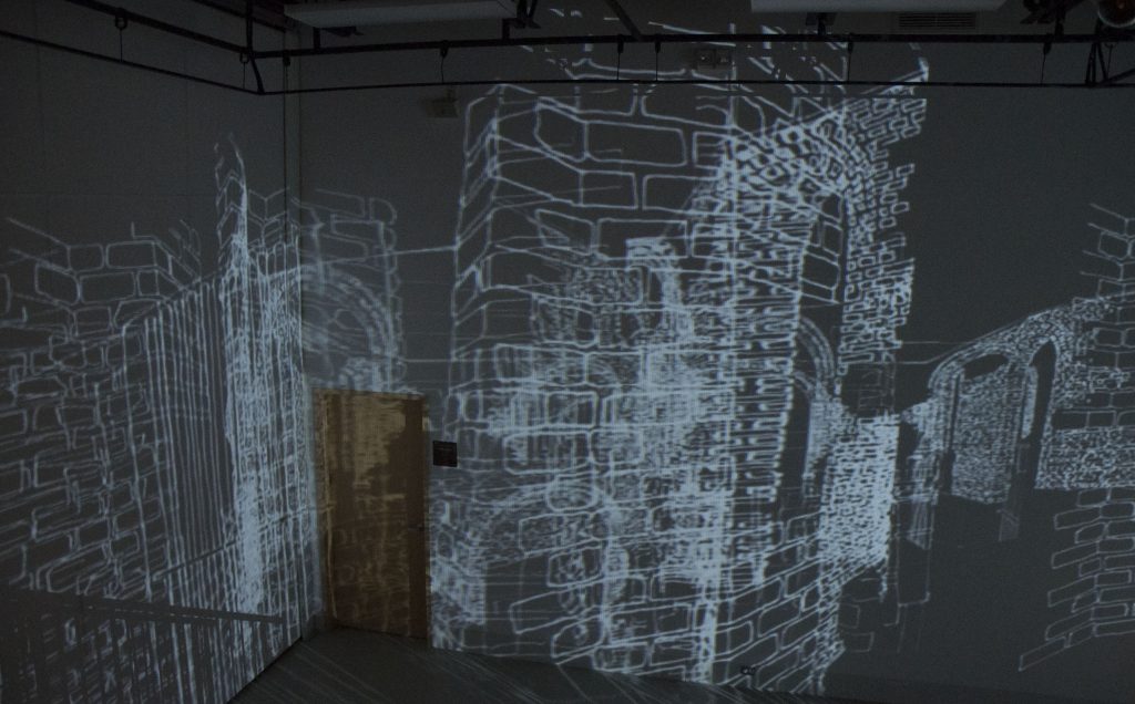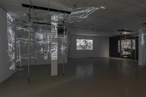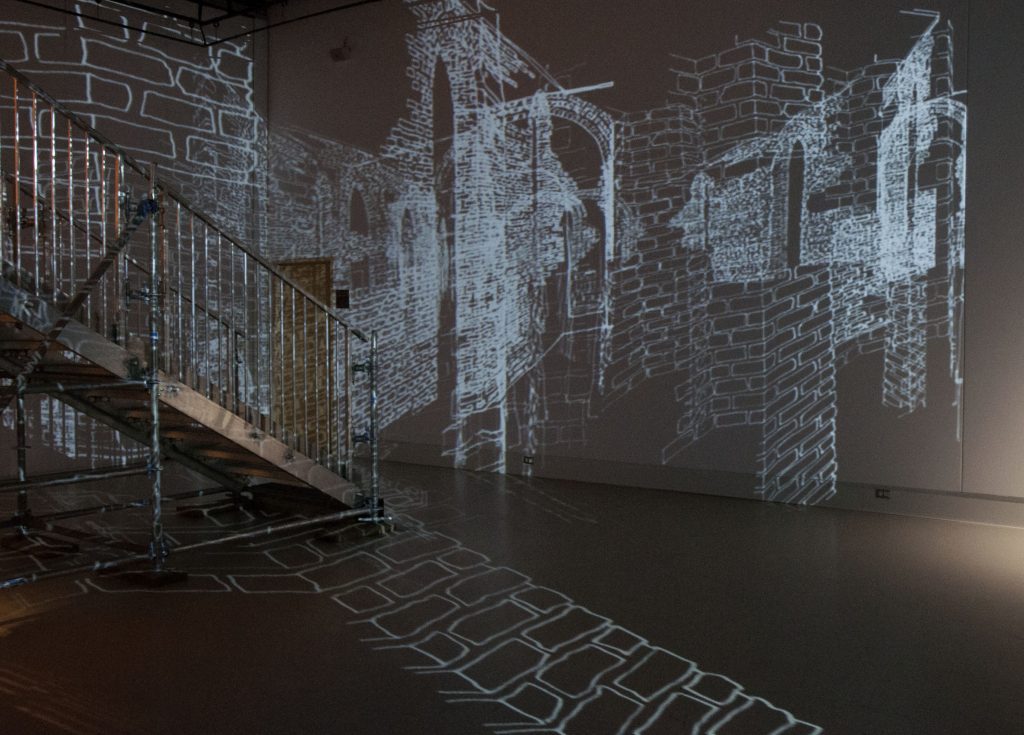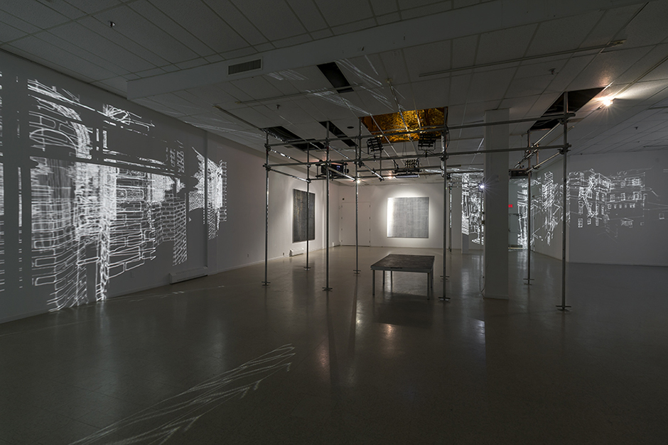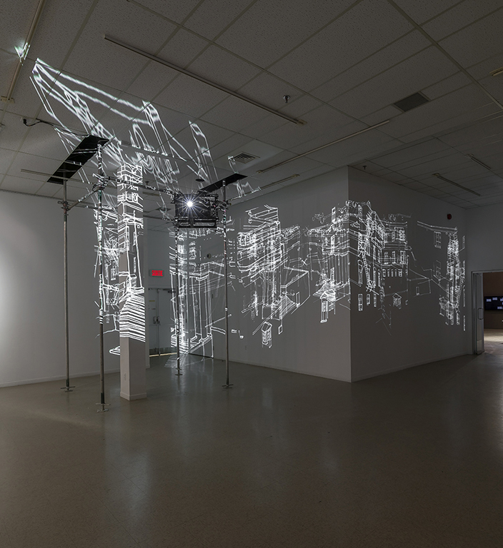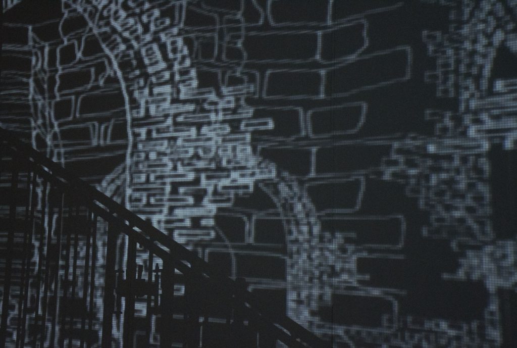 Il existe deux versions de l’installation in situ Les mailles du Vieux Palais dont l’origine est un bâtiment emblématique de la ville de Saint-Jérôme. Appelé par plusieurs Le Vieux Palais, cet ancien palais de justice et prison est aujourd’hui devenu un lieu culturel important qui accueille entre autres le Musée d’art contemporain des Laurentides. L’installation prend racine dans un moment charnière de l’histoire du lieu, un moment de basculement alors que l’avenir du bâtiment est devenu incertain. Suite à une prise d’otages en 1978, le bâtiment fût menacé d’être démoli puisque jugé trop dangereux pour le centre-ville. Grâce à une série de photographies prises lors d’une visite guidée pendant cette période transitoire, j’ai pu échantillonner des traces d’absence, extraire et tracer des formes qui m’ont servi à modéliser une nouvelle architecture. C’est sur ce canevas que s’animent et se croisent simultanément les traces de différentes époques, unifiées par la ligne dessinée. L’oeuvre se matérialise ici comme un processus de transformation de l’environnement immédiat où les lignes projetées tissent des brèches dans l’espace au contact de ses surfaces en proposant des points de vue alternatifs du lieu.